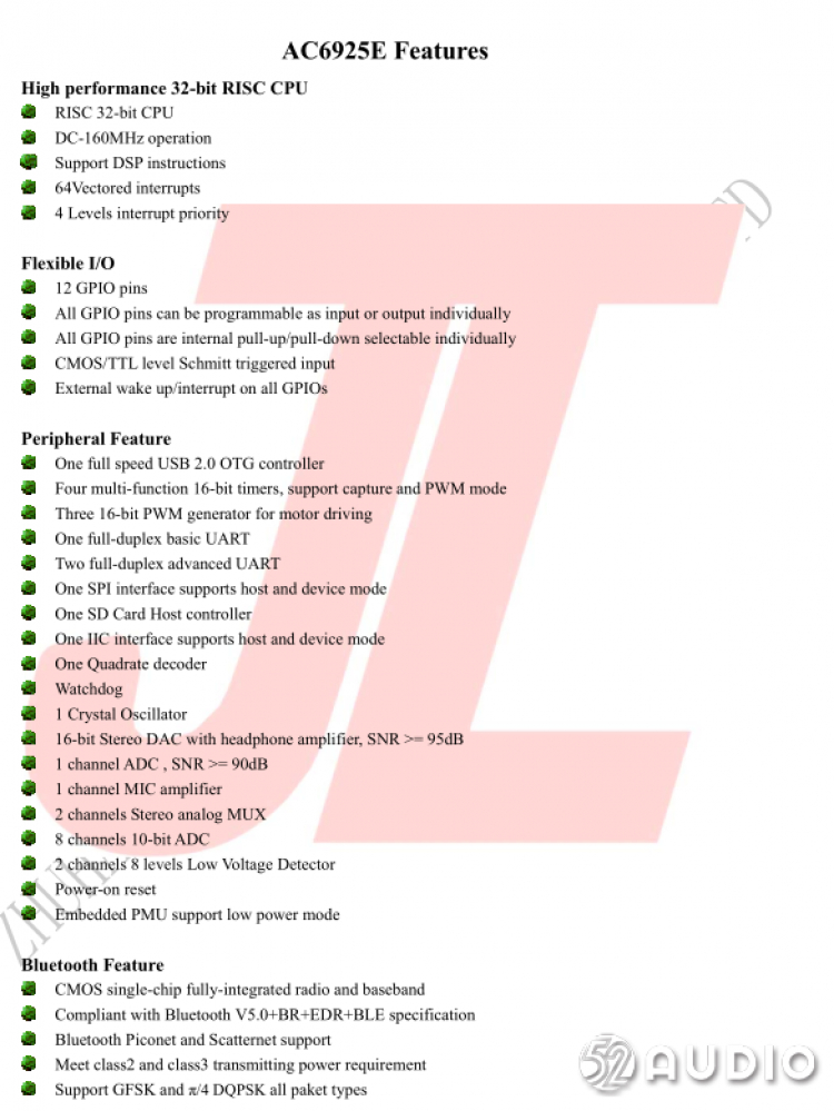JL杰理AC6925E 六合一(MCU+RF+Flash+FM+BLE+NFC )双模TWS低功耗音箱芯片,是一款高性能32位RISC处理器。支持蓝牙V5.0;支持DSP指令;拥有一个全速USB 2.0 OTG控制器,四个多功能16位定时器,支持捕捉和PWM模式。