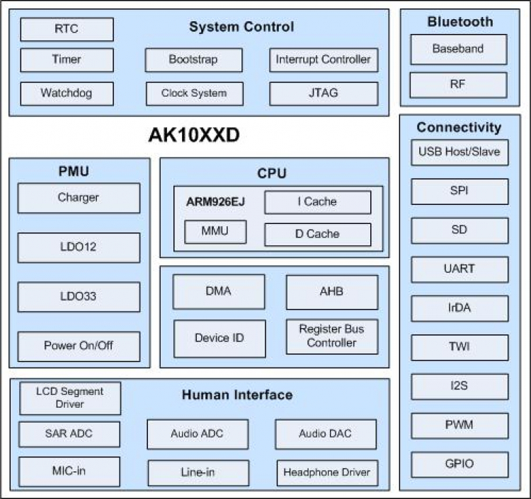 AK10D系列处理器采用ARM926EJ-S内核,内置RAM,终端产品无需外挂RAM类型存储器。AK10D系列处理器集成蓝牙收发器(射频电路+基带电路)、电源管理电路、音频ADC/DAC、USB2.0高速主从控制器、MMC/SD控制器以及其它丰富的功能模块和接口,具有很高的集成度,大大简化了终端产品的设计复杂度,降低了产品成本,提高了产品可靠度。