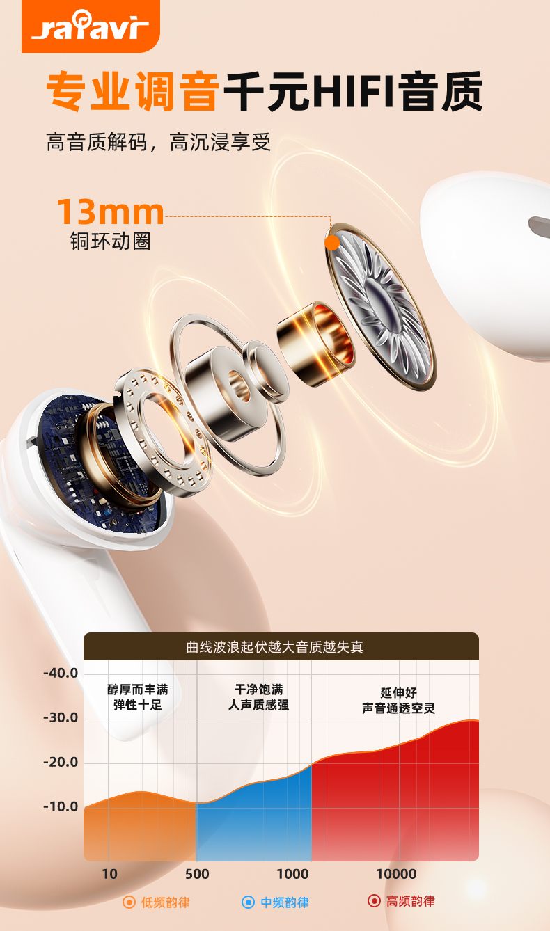 - 搭载 13mm 高保真动圈单元,三频均衡,高音通透、中音细腻、低音澎湃,音乐细节分毫毕现。