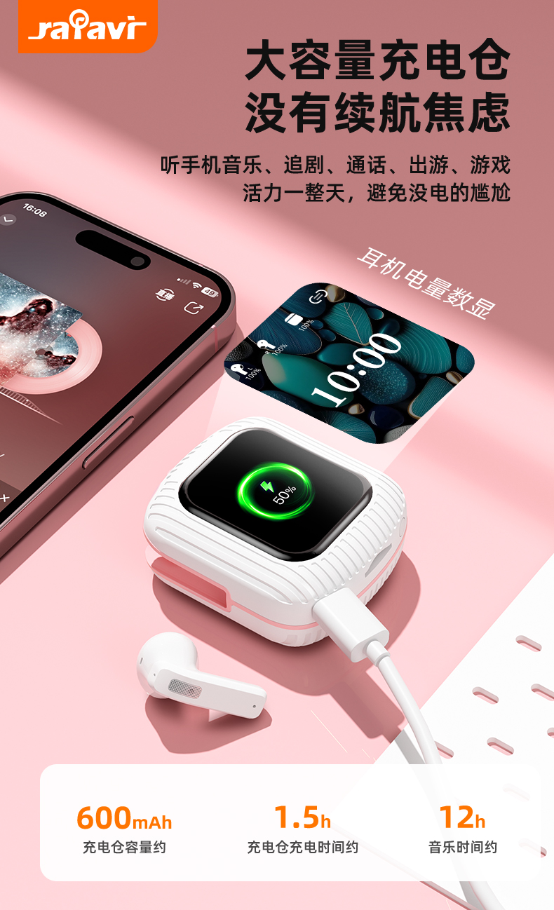 - 耳机单次续航 6小时,搭配充电仓可达 30小时 超长续航,一周通勤不用充!