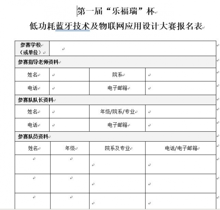 第一届蓝牙技术资讯网"乐福瑞"低功耗蓝牙技术及物联网应用设计大赛报名表格下载链接