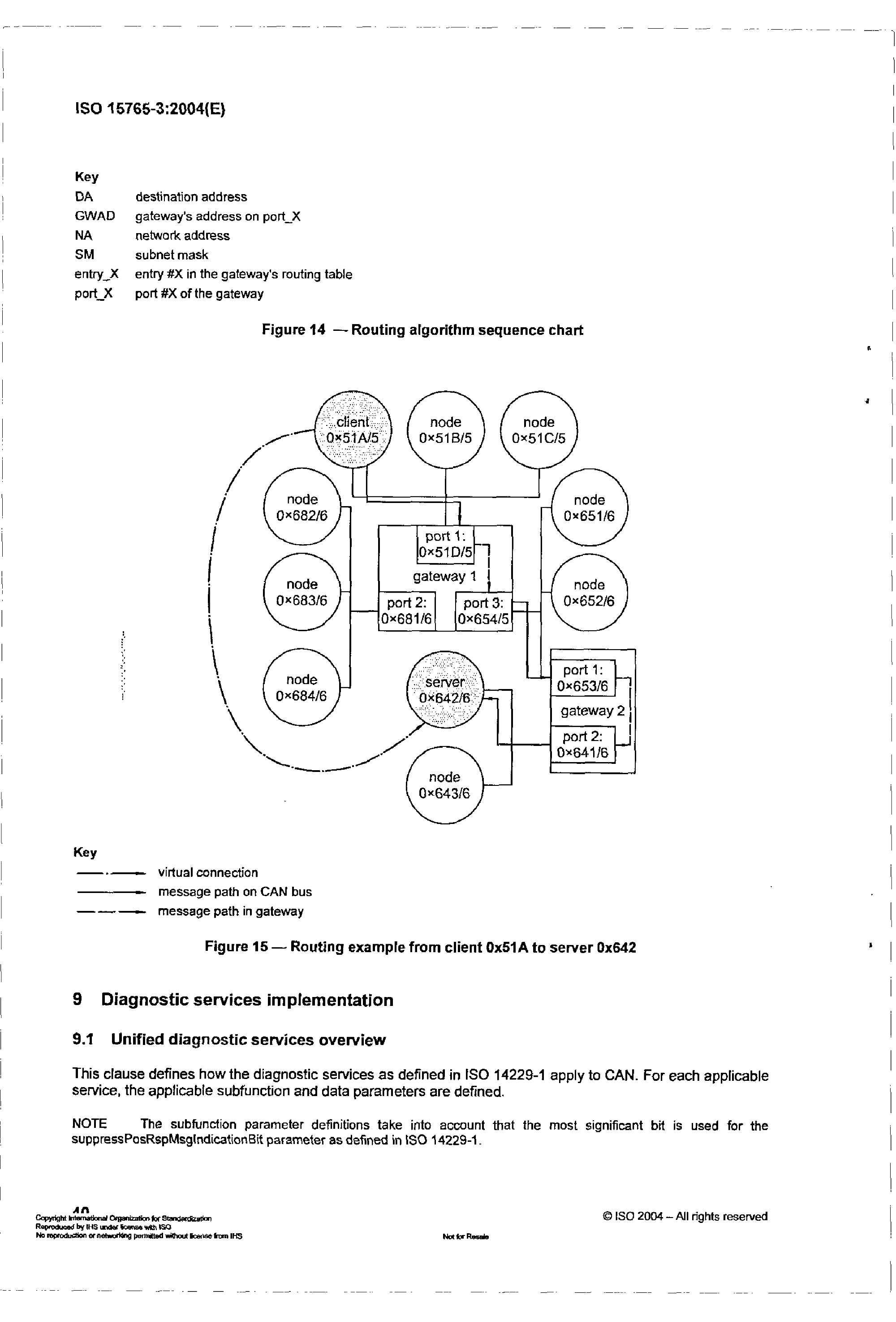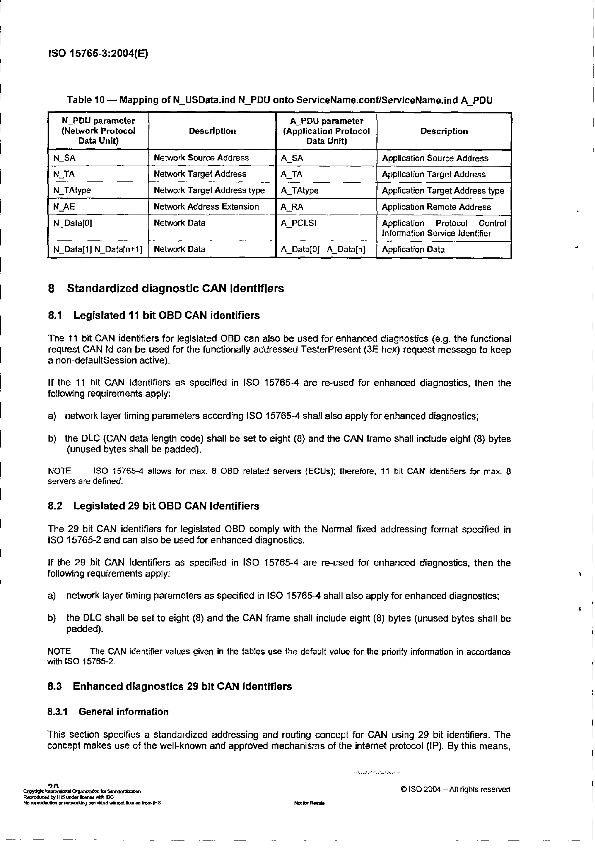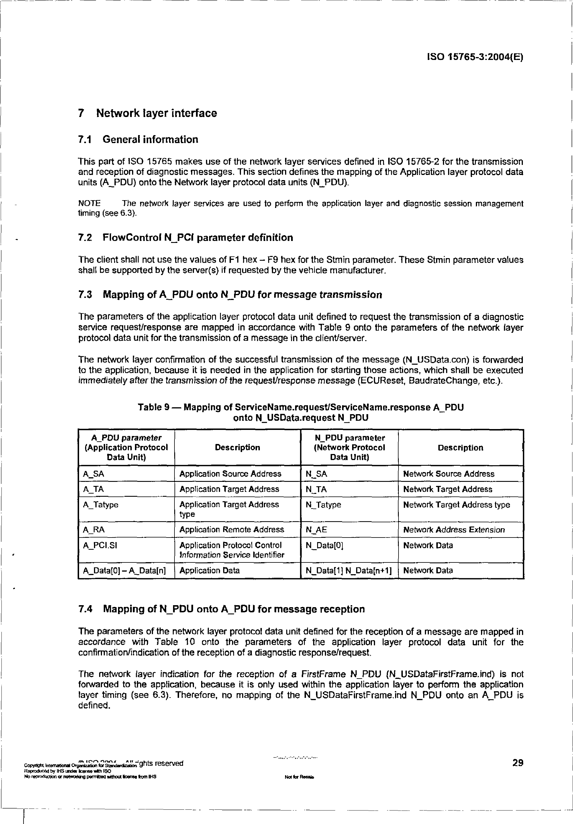 This part of ISO 15765 makes use of the network layer services defined in ISO 15765- 2 for the transmission and reception of diagnostic messages. This section defines the mapping of the Application layer protocol data units (A PDU) onto the Network layer protocol data units (N PDU).
