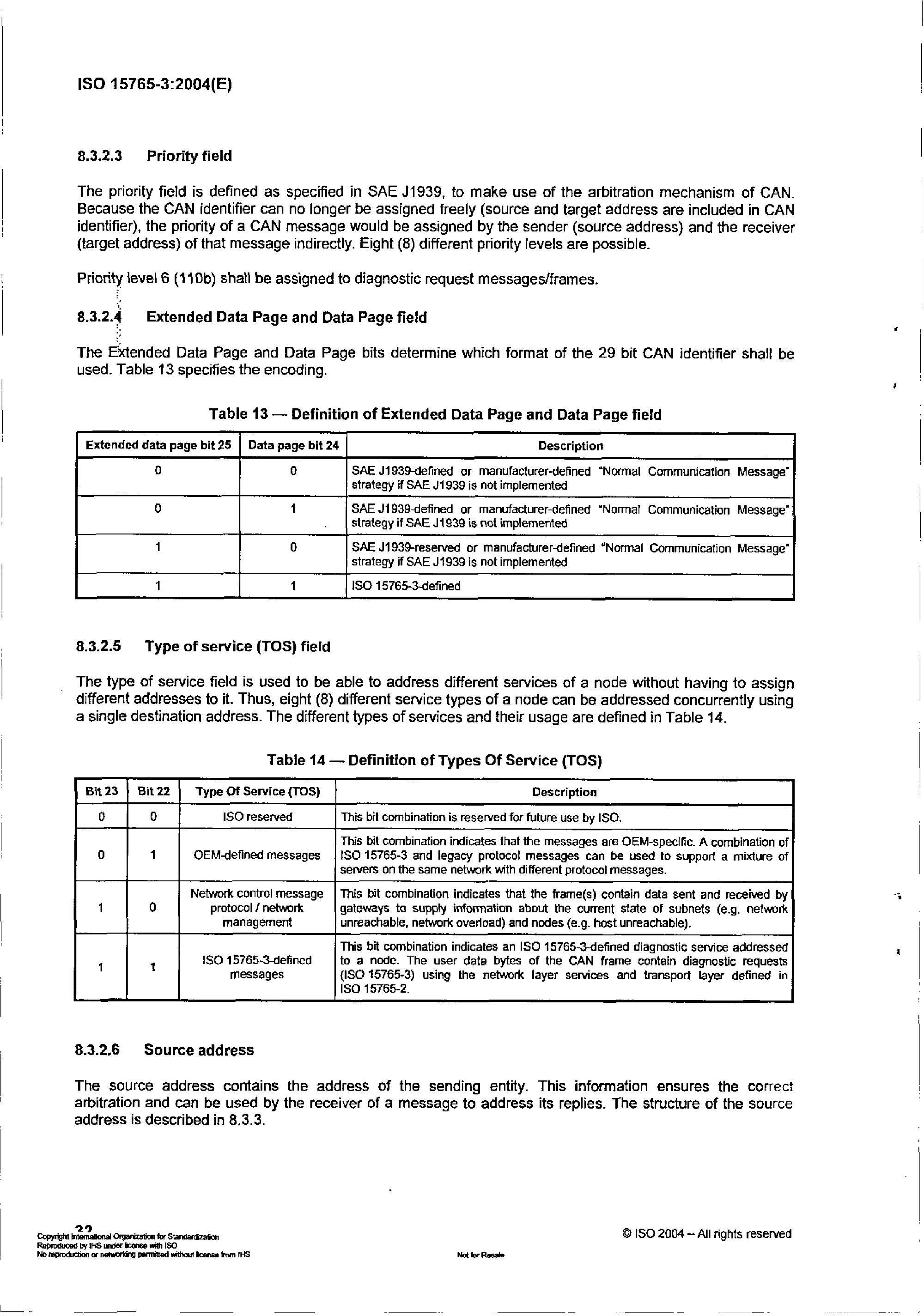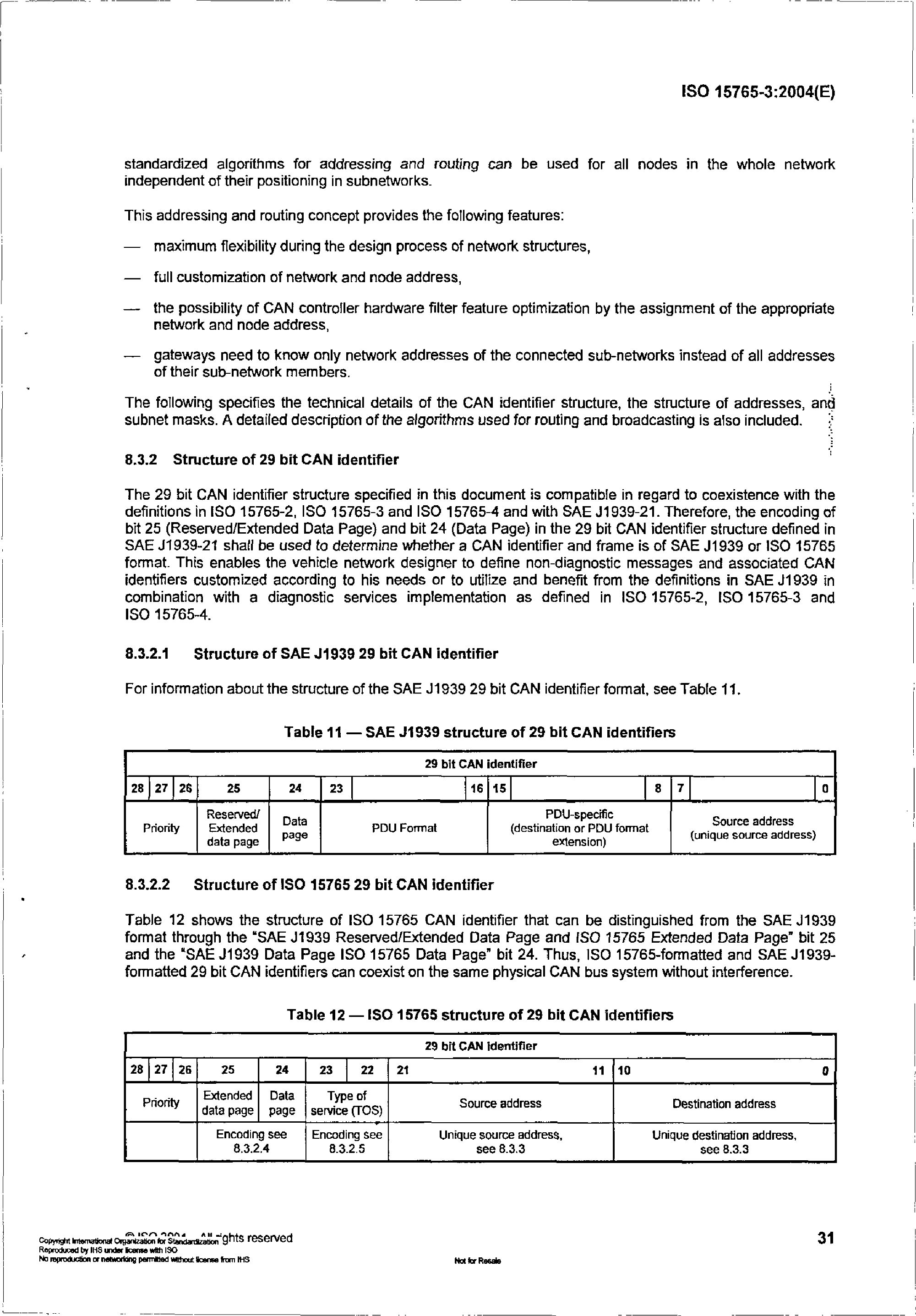 Table 12 shows the structure of ISO 15765 CAN identifier that can be distinguished from the SAE J1939 fomat through the“SAE J1939 Reserved/Extended Data Page and ISO 15765 Extended Data Page" bit 25 and the“SAE J1939 Data Page ISO 15765 Data Page" bit 24.Thus, 1SO 1 5765-fomatted and SAE J1939- formatted 29 bit CAN identifiers can coexist on the same physical CAN bus system without interference.