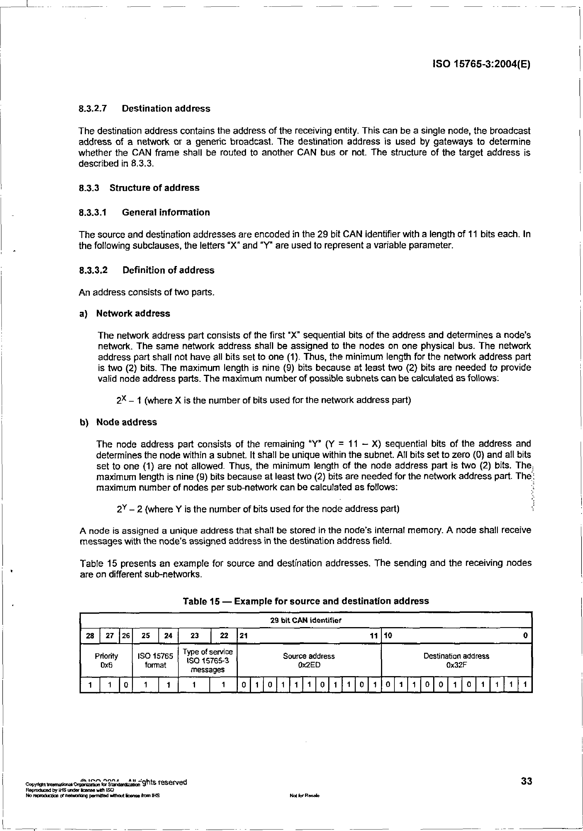 The source and destination addresses are encoded in the 29 bit CAN identifer with a length of 11 bits each. In the following subclauses, the ltters X" and °丫are used to represent a variable parameter.