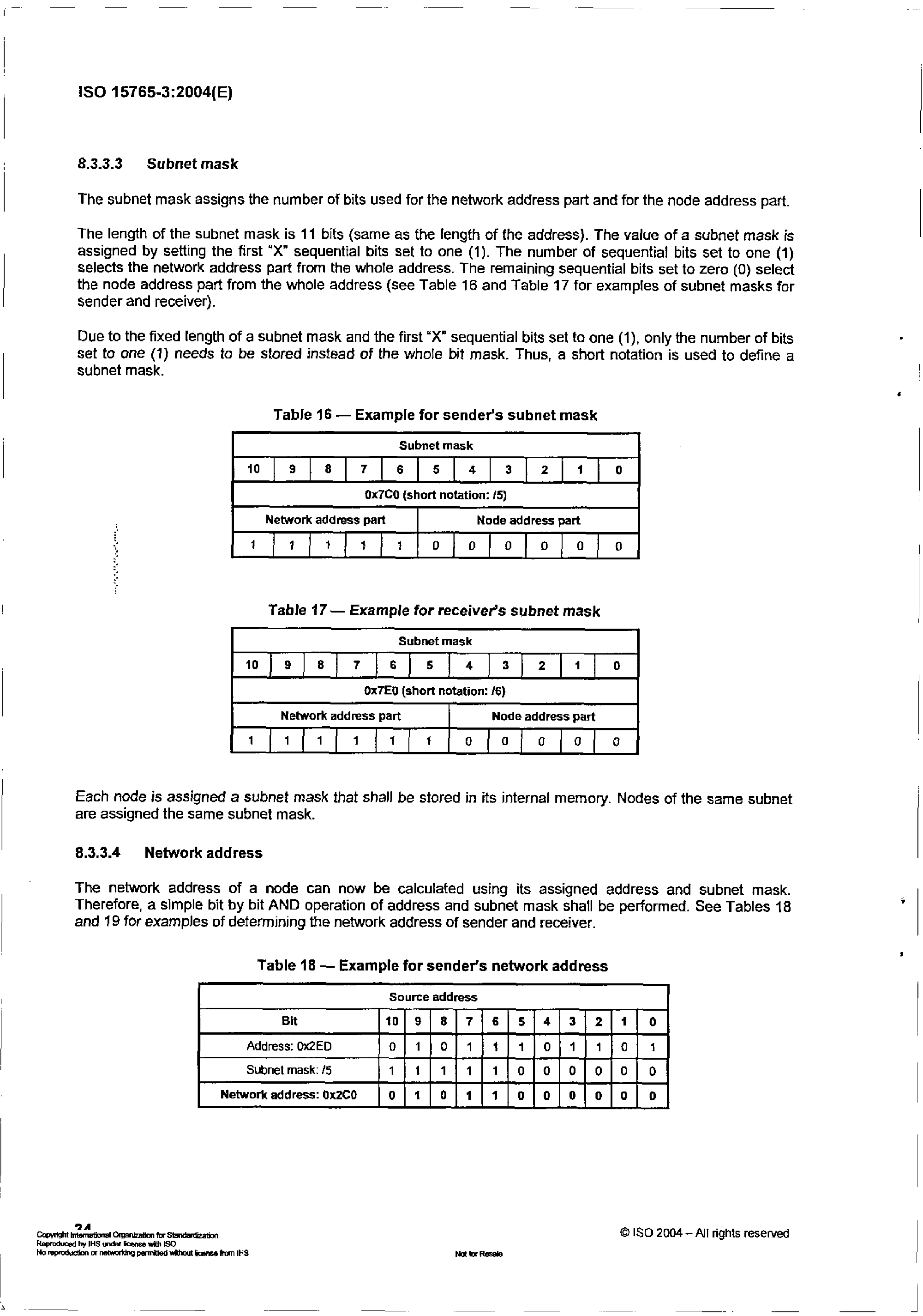The nelwork address part consists of the first“X° sequential bits of the address and determines a node's network. The same network address shall be assigned to the nodes on one physical bus. The network address part shall not have all bits set to one (1). Thus, the minimum length for the network address part is two (2) bits. The maximum length is nine (9) bits because at least two (2) bits are needed to provide valid node address parts. The maximum number of possible subnets can be calculated as follows: