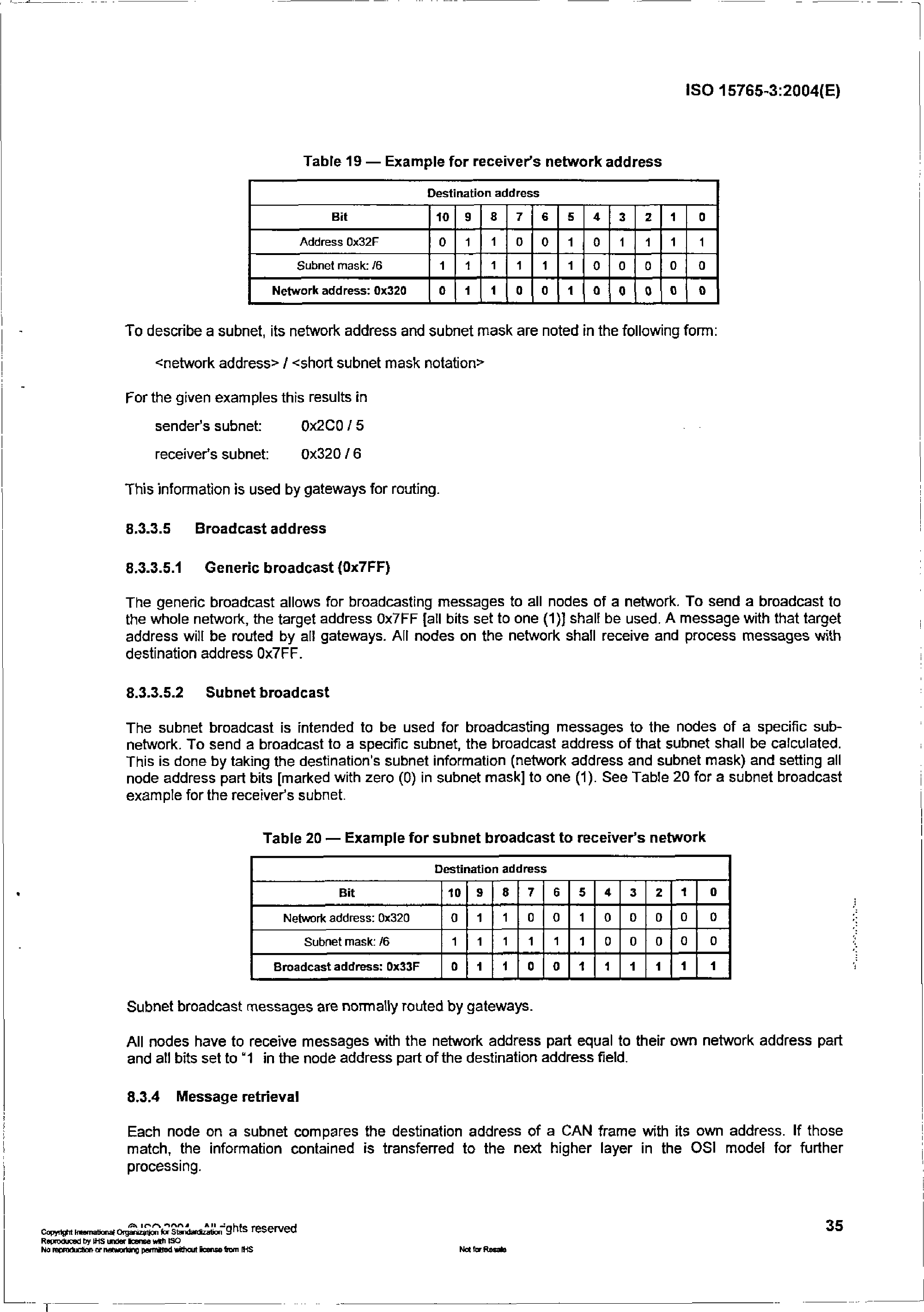 The destination address contains the address of the receiving entity. This can be a single node, the broadcast address of a network or a genenc broadcast. The destination address is used by gateways to determine whether the CAN frame shall be routed to another CAN bus or not. The structure of the target address is described in 8.3.3.